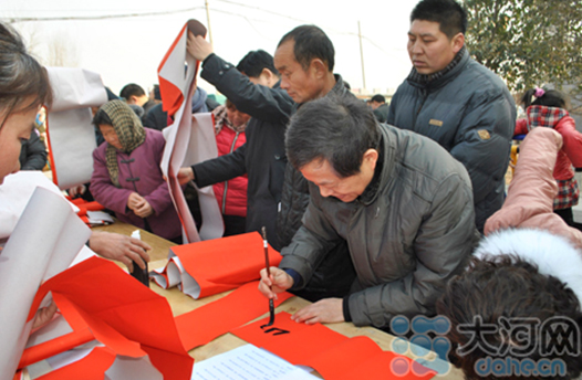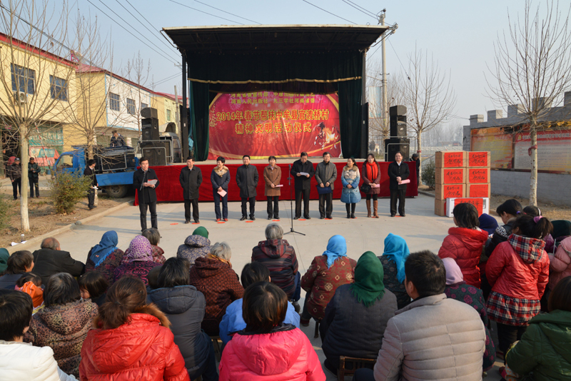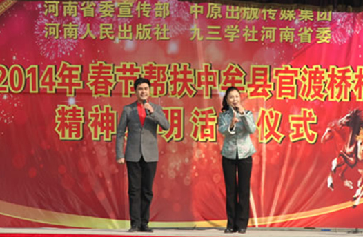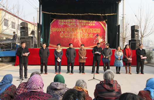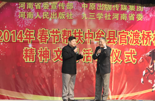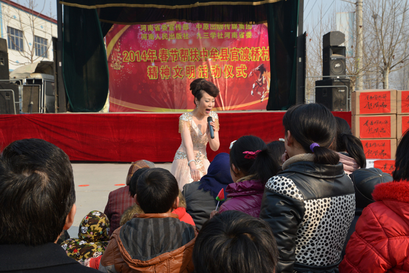省委宣傳部副巡視員杜瑞明代表省直四家單位講了話,向官渡橋村村民送上節(jié)日的祝福。隨后,慰問團的領導向官渡橋村農民群眾和小學生贈送了文體用品。由省委宣傳部邀請的薛青、郝曉冬等省內多位知名演員為村民們表演了歌舞《田野里的春天》、豫劇《朝陽溝》選段、相聲《大腕研究》、嗩吶《百鳥朝鳳》等七個精彩的節(jié)目。在近兩個小時的演出中,臺上演員們精彩的表演,博得群眾的陣陣掌聲。省委宣傳部機關黨委專職副書記李憲林、創(chuàng)建處處長張德偉揮毫潑墨,現(xiàn)場為鄉(xiāng)親們義寫春聯(lián)。省九三學社邀請的省醫(yī)療專家為鄉(xiāng)親們傳播健康衛(wèi)生知識,現(xiàn)場檢查治療。中原出版集團和河南人民出版社為鄉(xiāng)親們贈送了科技圖書讓大家過春節(jié)時學習,整個慰問活動場面熱烈,氛圍濃厚。
